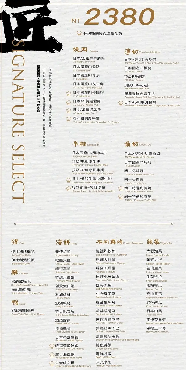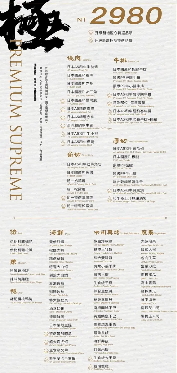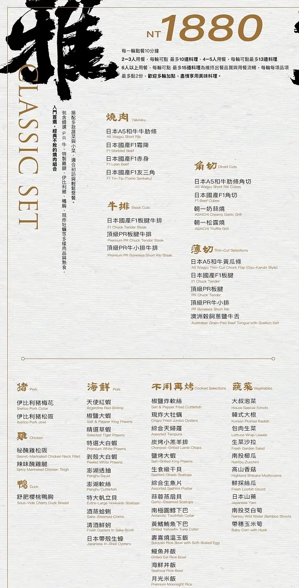 店內採單點燒肉、無限供應形式,$1,880 起即可無限享用 A5 和牛月見燒、龜子肉、厚切牛舌、手臂蝦、現炸牡蠣等近百道珍稀食材,並佐以雪場蟹腿、生魚片、天婦羅等多樣熟食與生食料理。